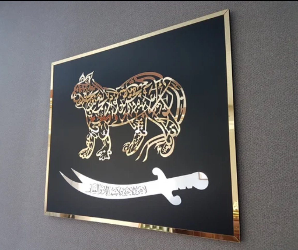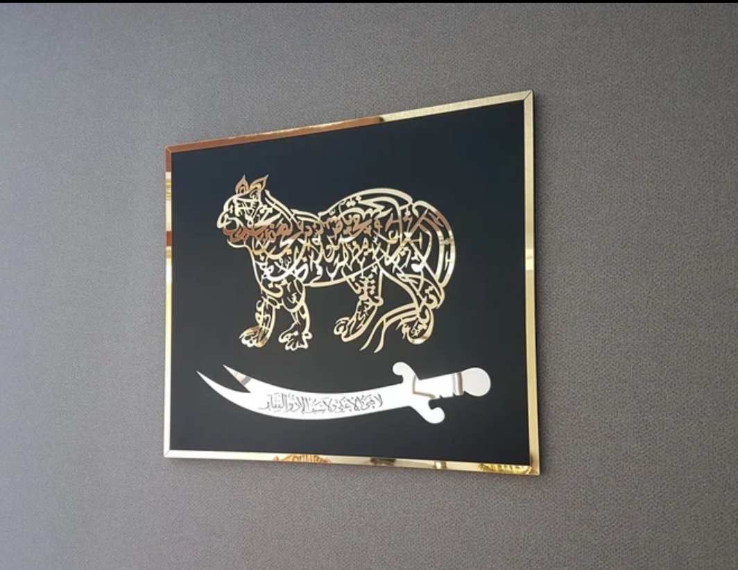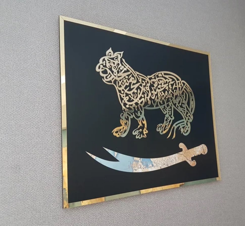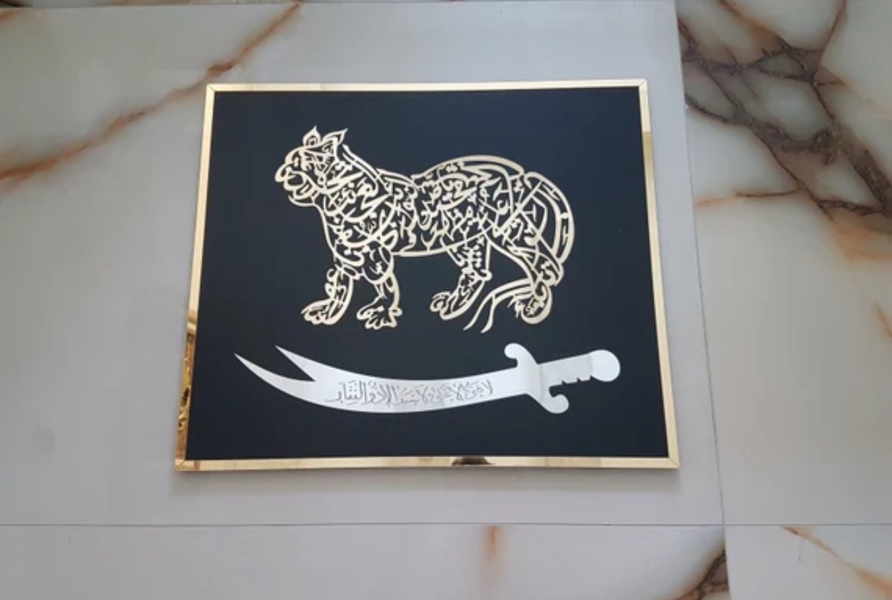 • Nad-e-Ali Lion with Zulfiqar Sword wall frame and spacers for mounting.
